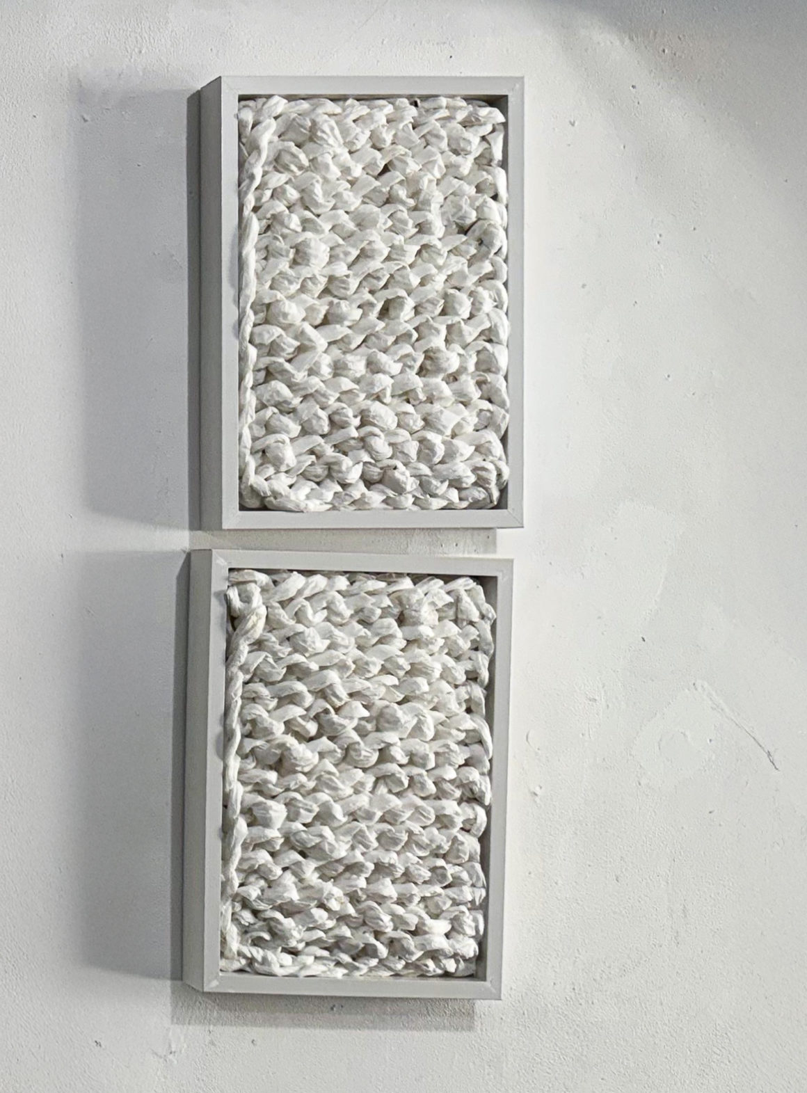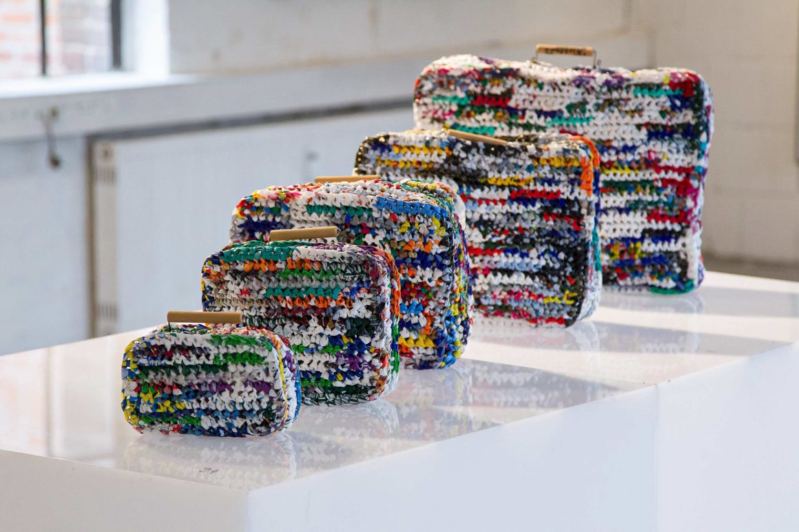 Kofferset aus Plastikstreifen - Softsculpture gehäkelt 2003 5-teilige Objektgruppe