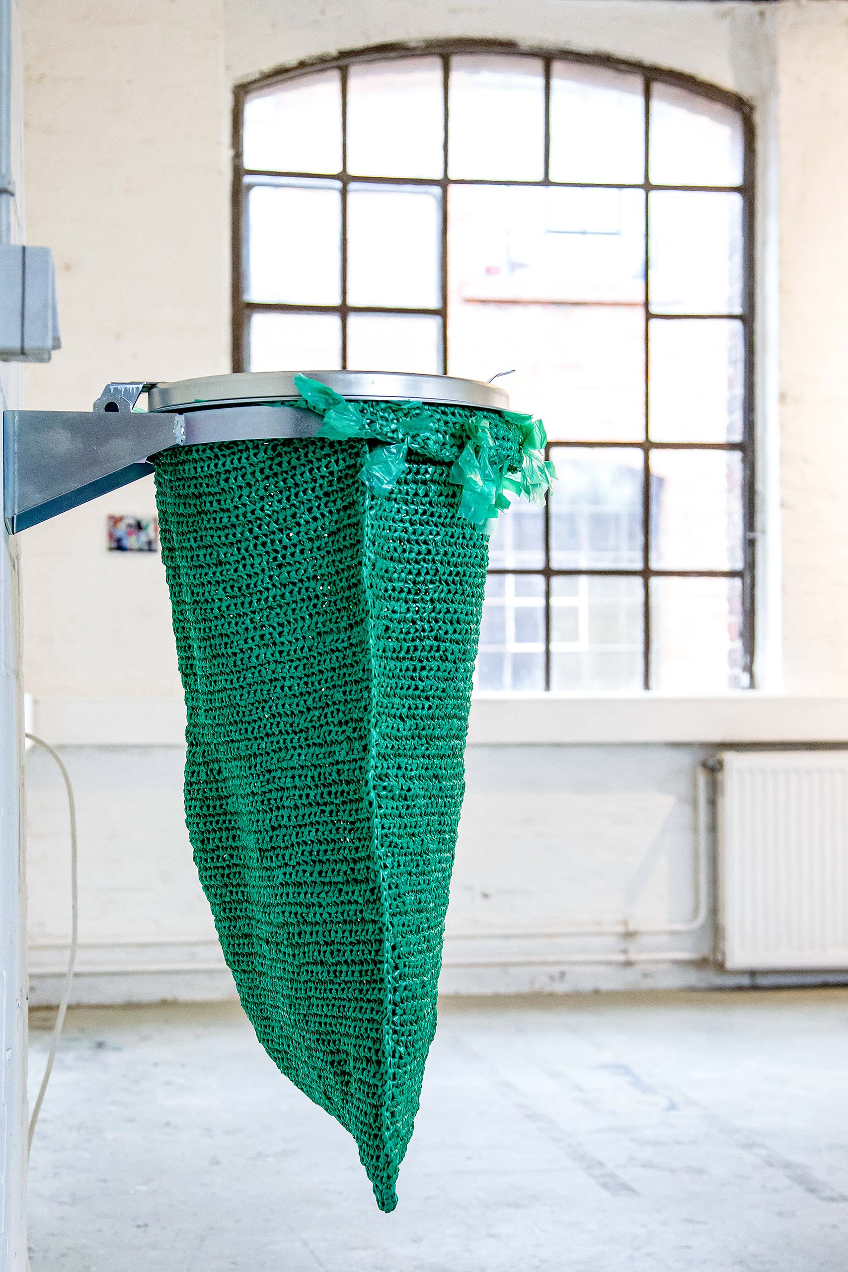 Grüne Mülltüten Häkelskulptur 110 x 40 x 40 cm